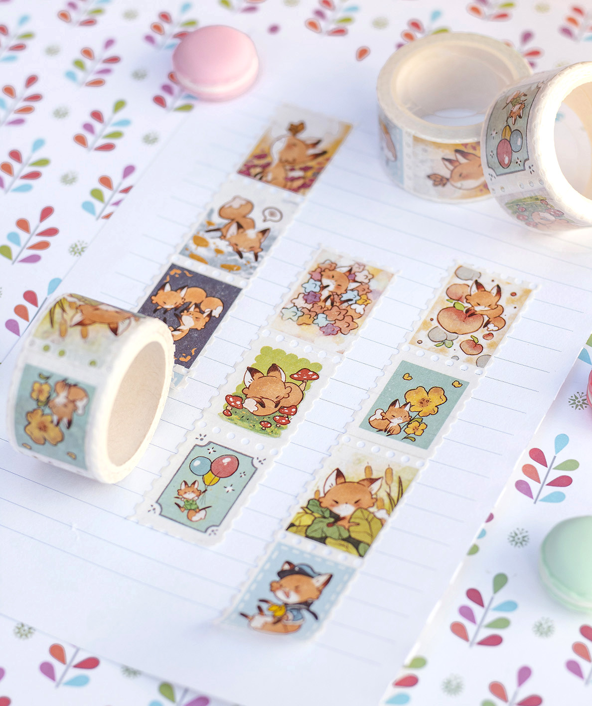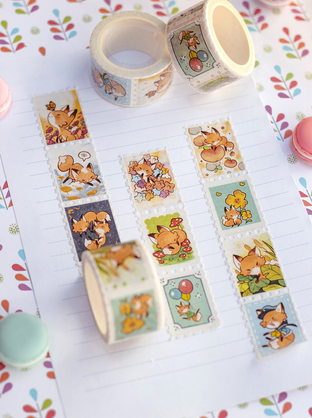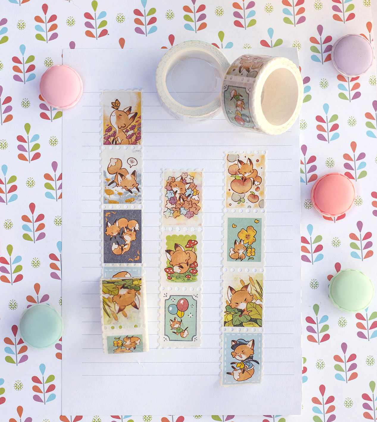 Including 10 desing in the same roll. A washi stamp for those who loves foxies, you can decorated your notebooks or just make everything more colorful!